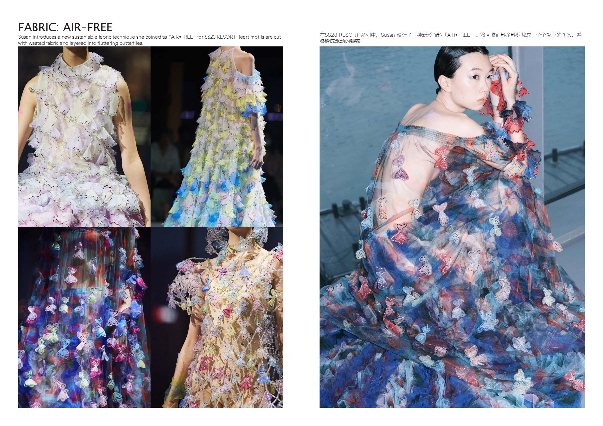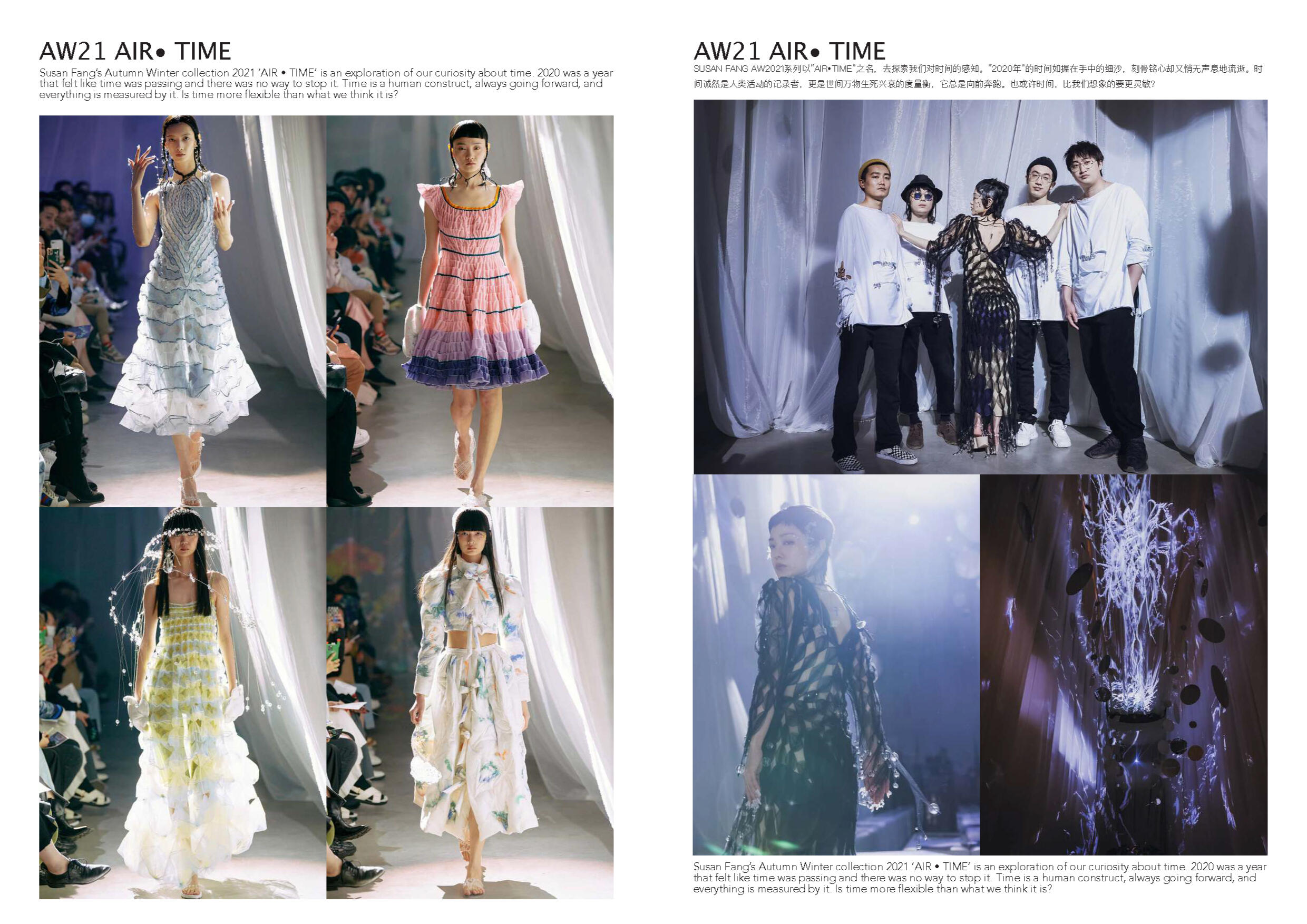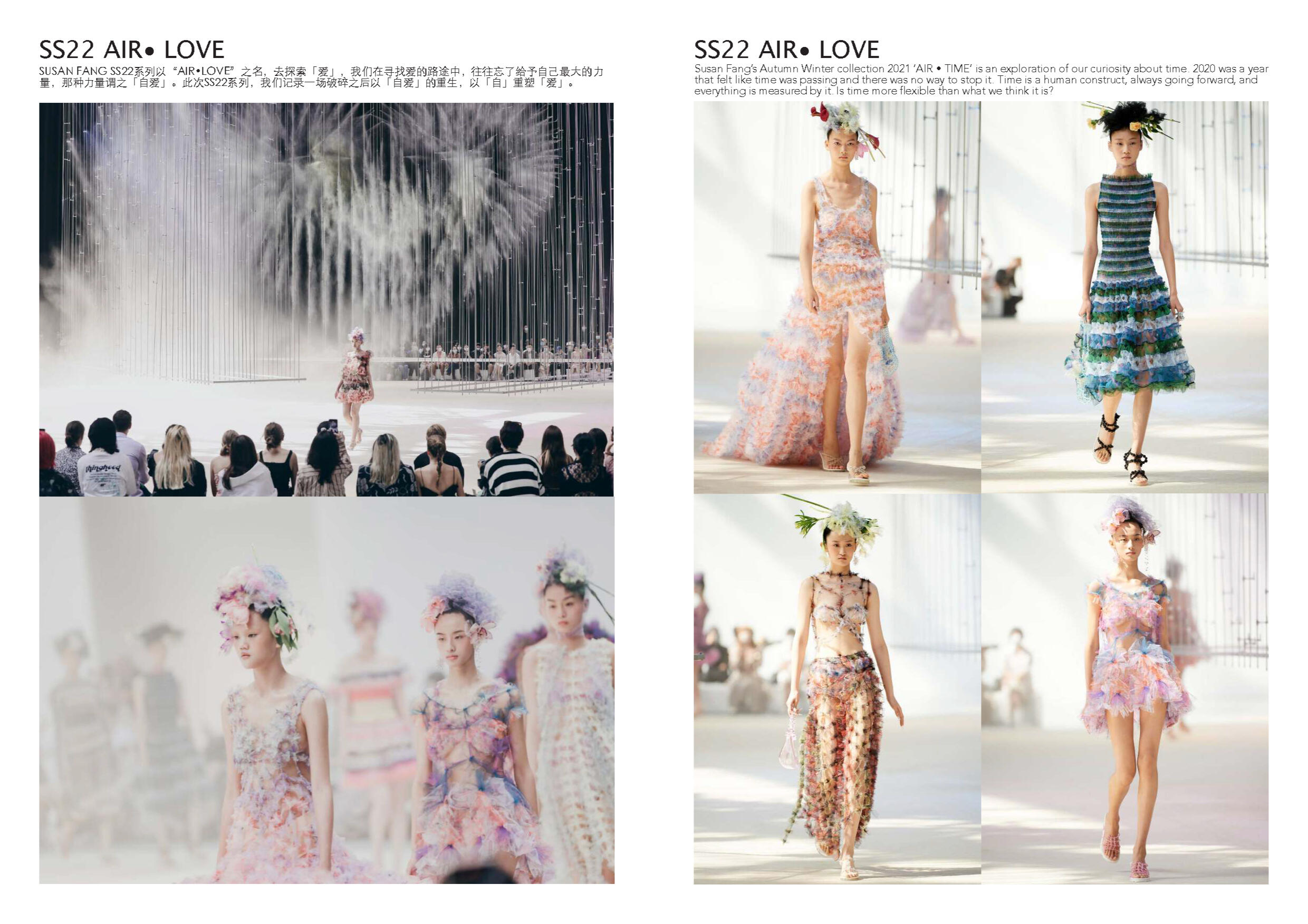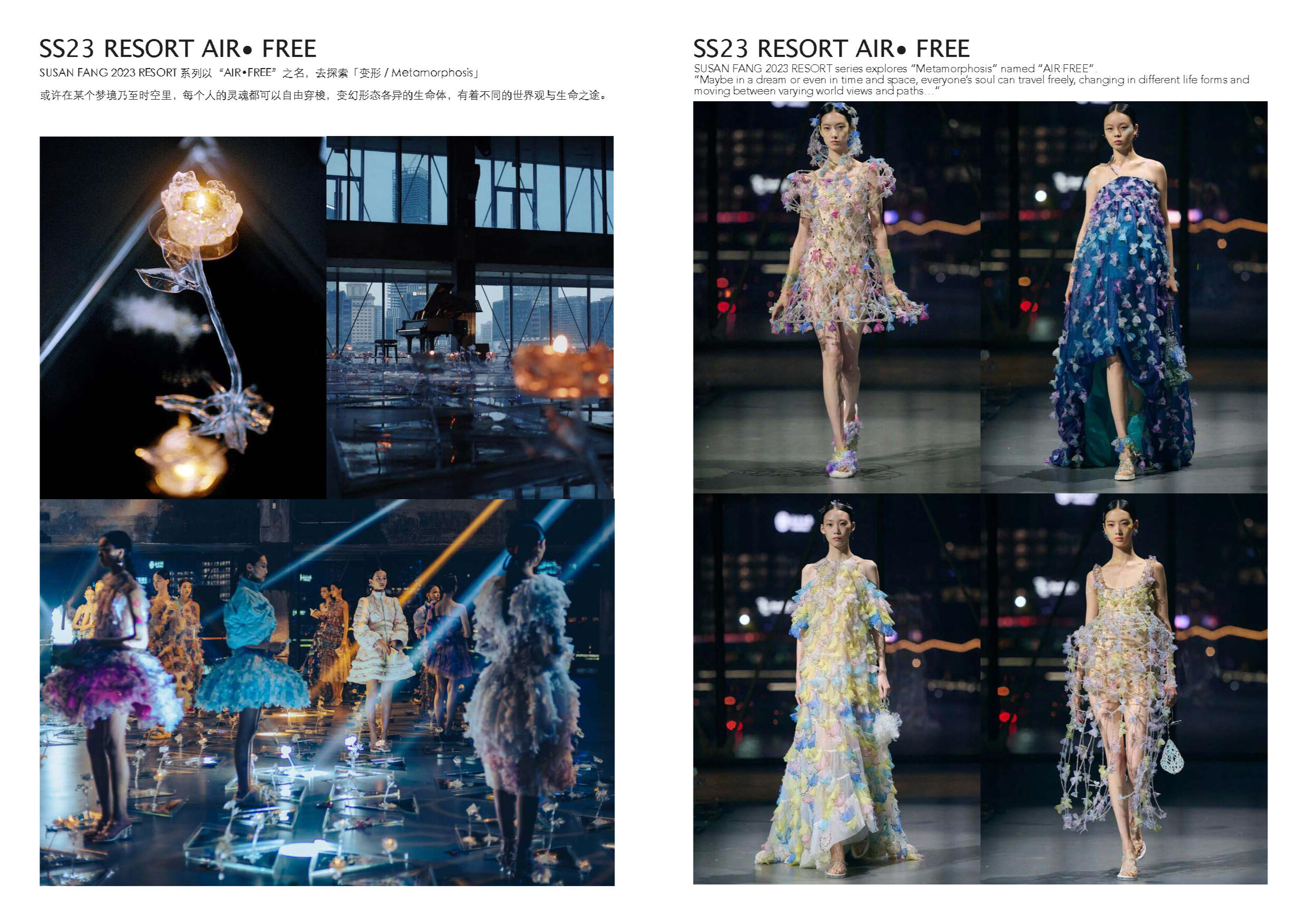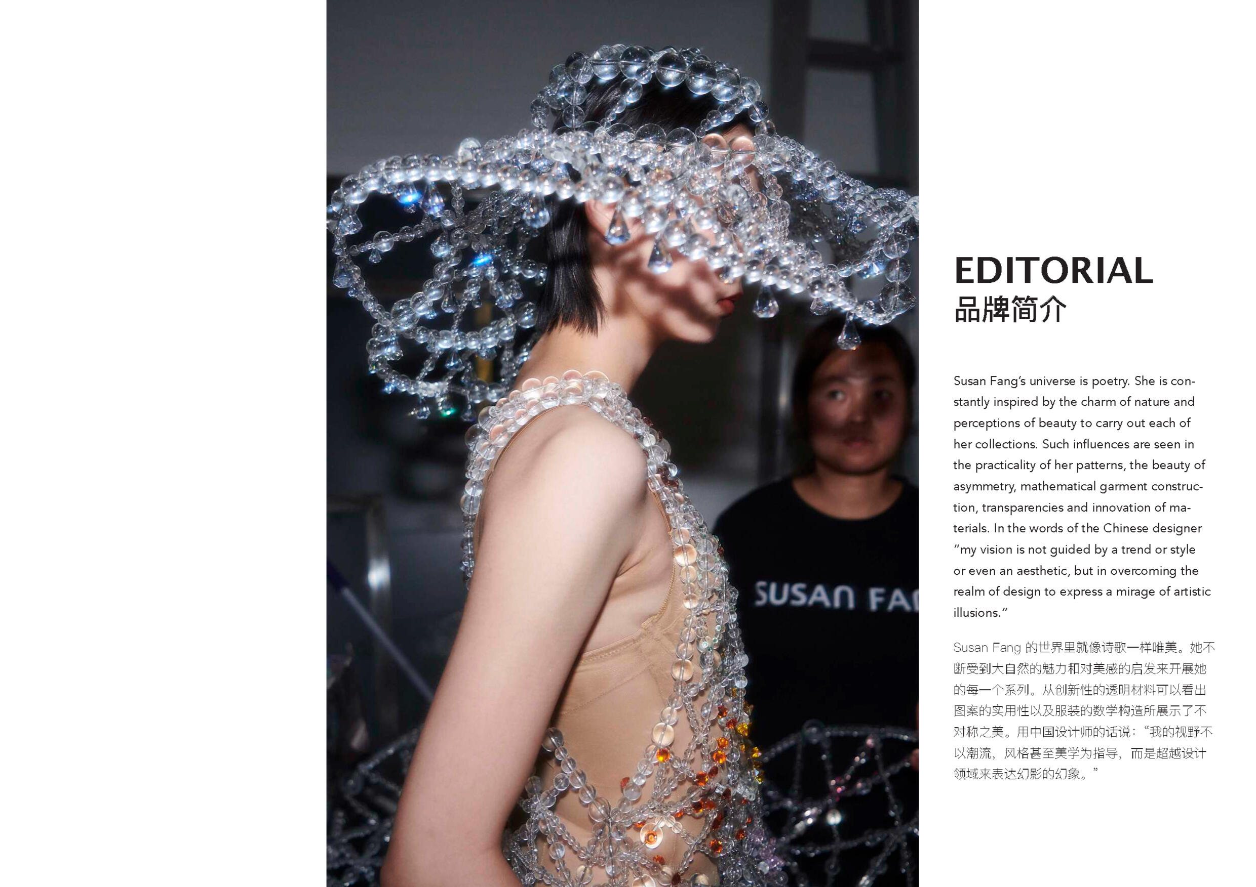 Susan Fang 的世界里就像诗歌一样唯美。她不 断受到大自然的魅力和对美感的启发来开展她 的每一个系列。从创新性的透明材料可以看出 图案的实用性以及服装的数学构造所展示了不 对称之美。用中国设计师的话说:“我的视野不 以潮流,风格甚至美学为指导,而是超越设计 领域来表达幻影的幻象。”