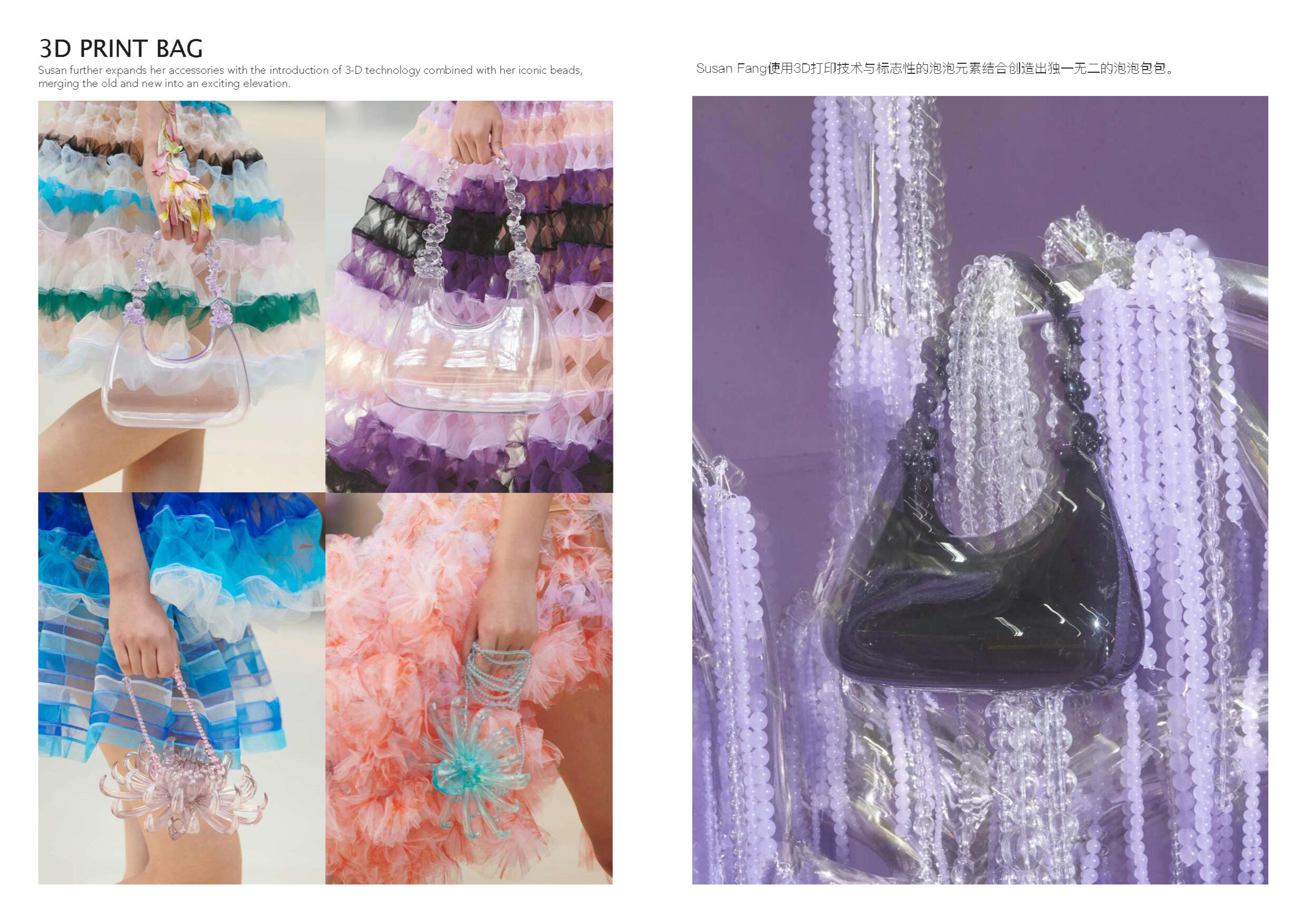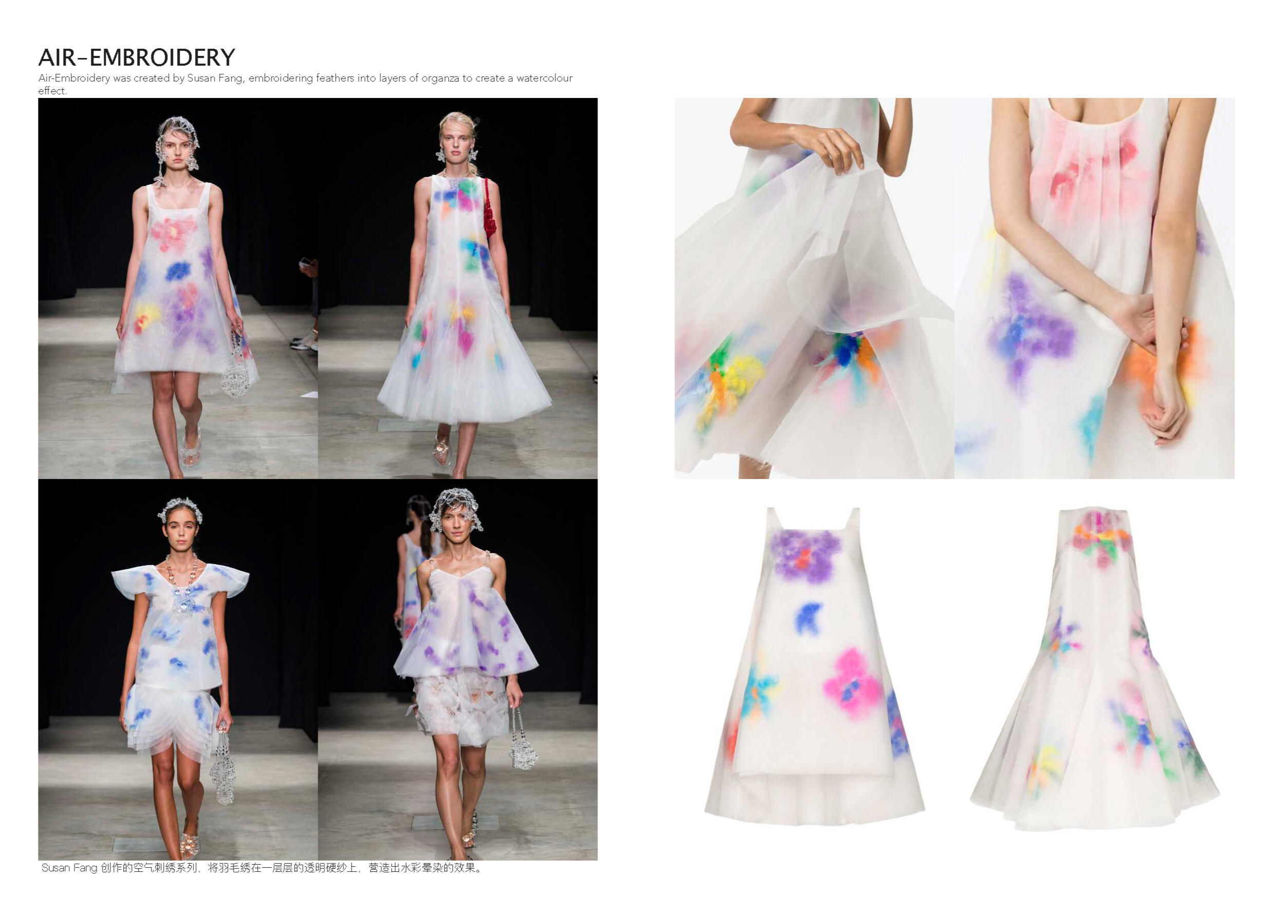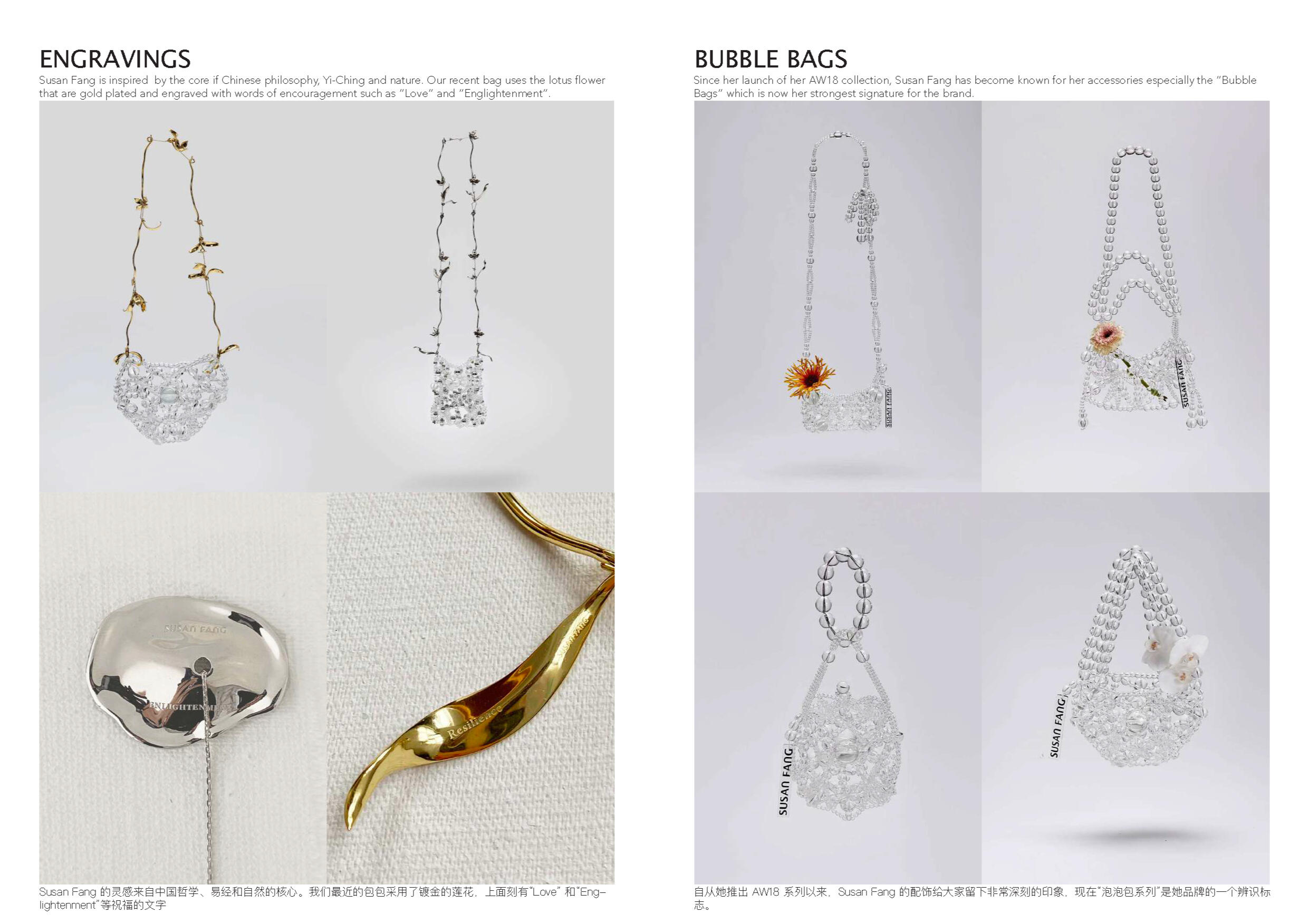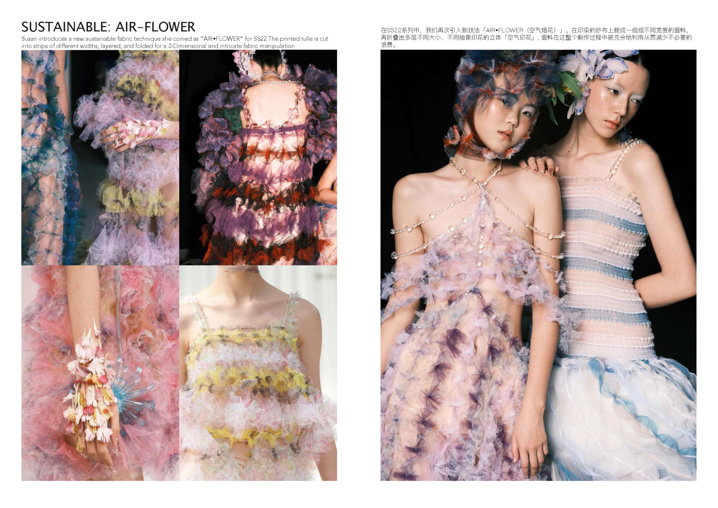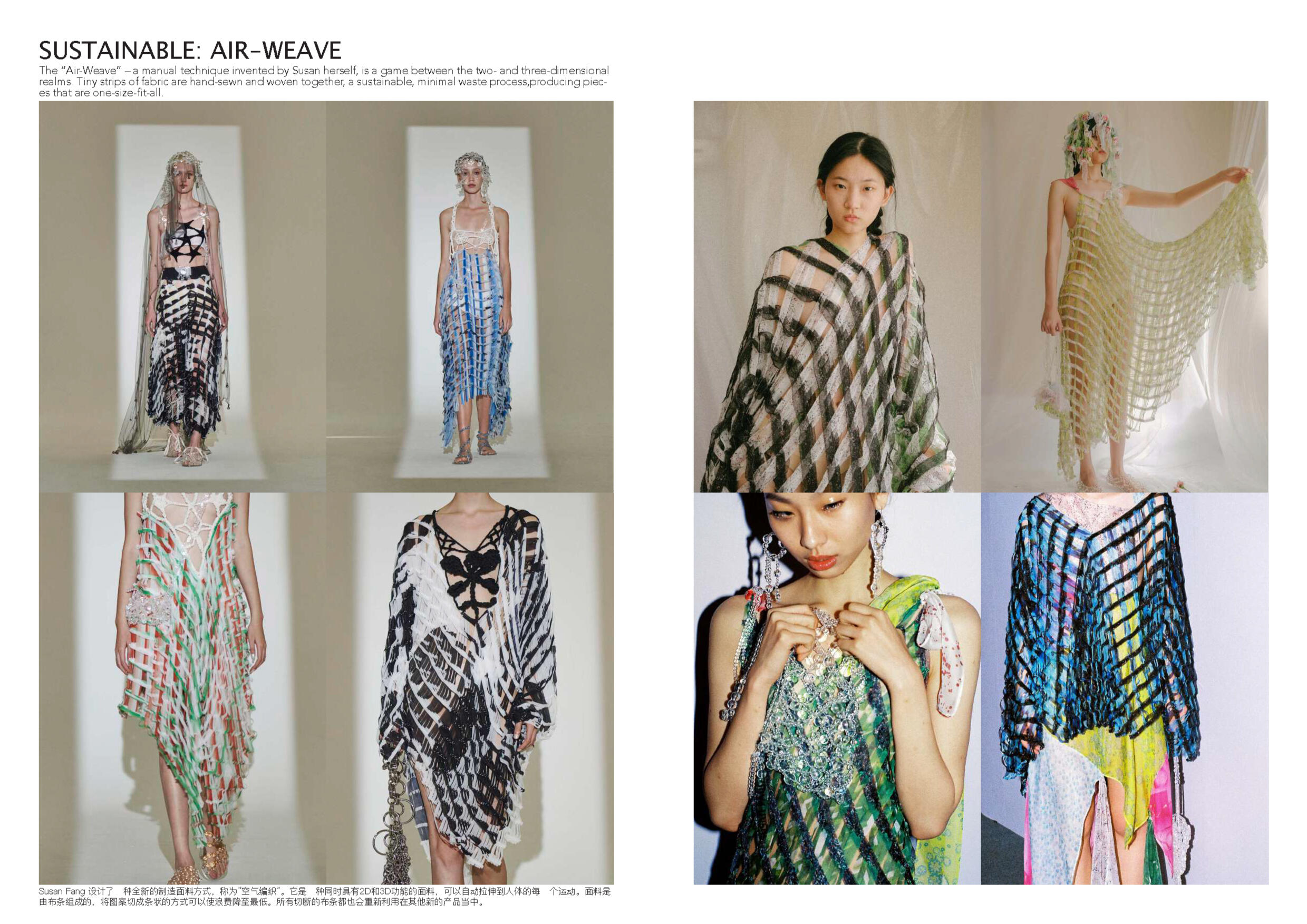 Susan Fang 的世界里就像诗歌一样唯美。她不 断受到大自然的魅力和对美感的启发来开展她 的每一个系列。从创新性的透明材料可以看出 图案的实用性以及服装的数学构造所展示了不 对称之美。用中国设计师的话说:“我的视野不 以潮流,风格甚至美学为指导,而是超越设计 领域来表达幻影的幻象。”