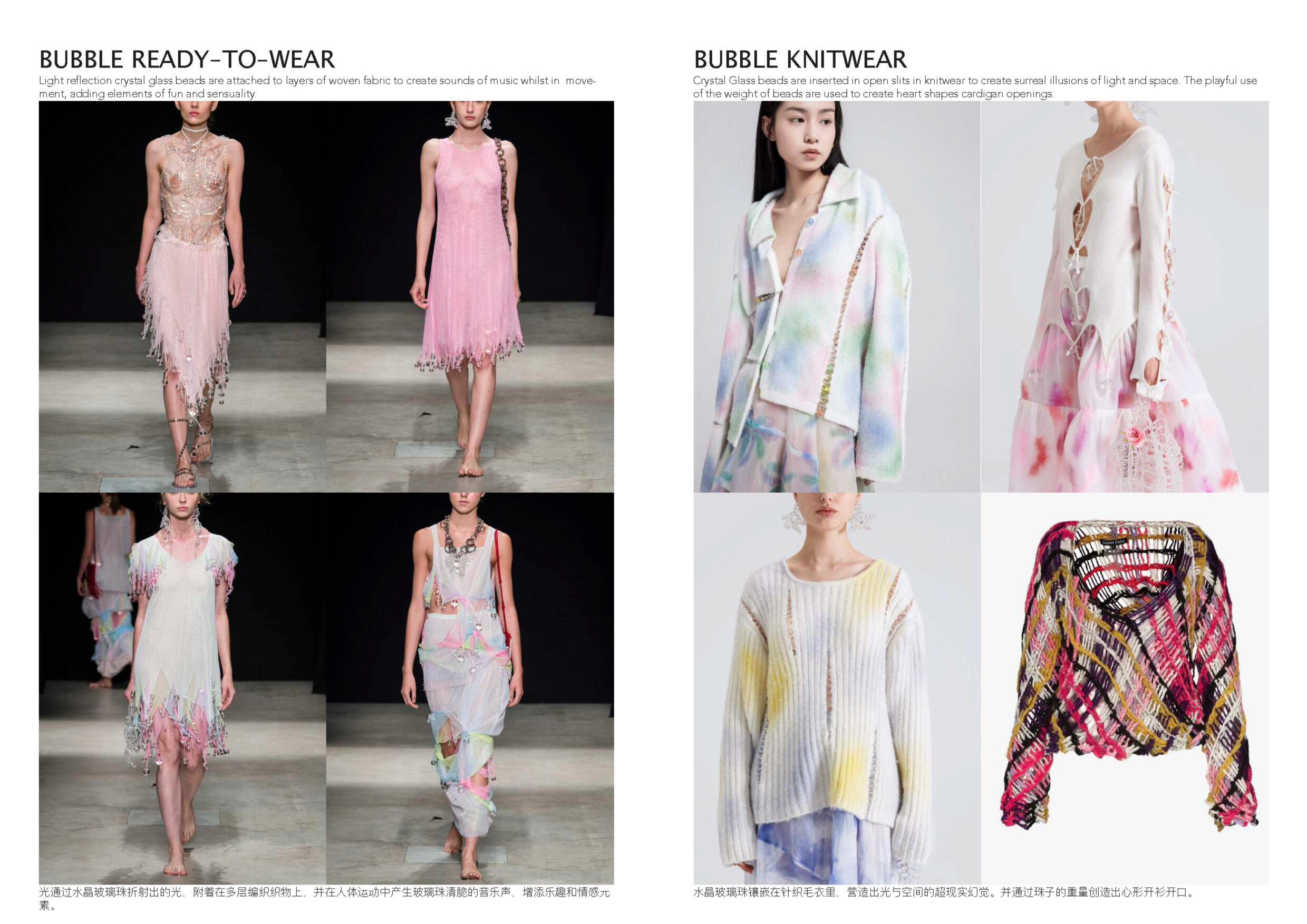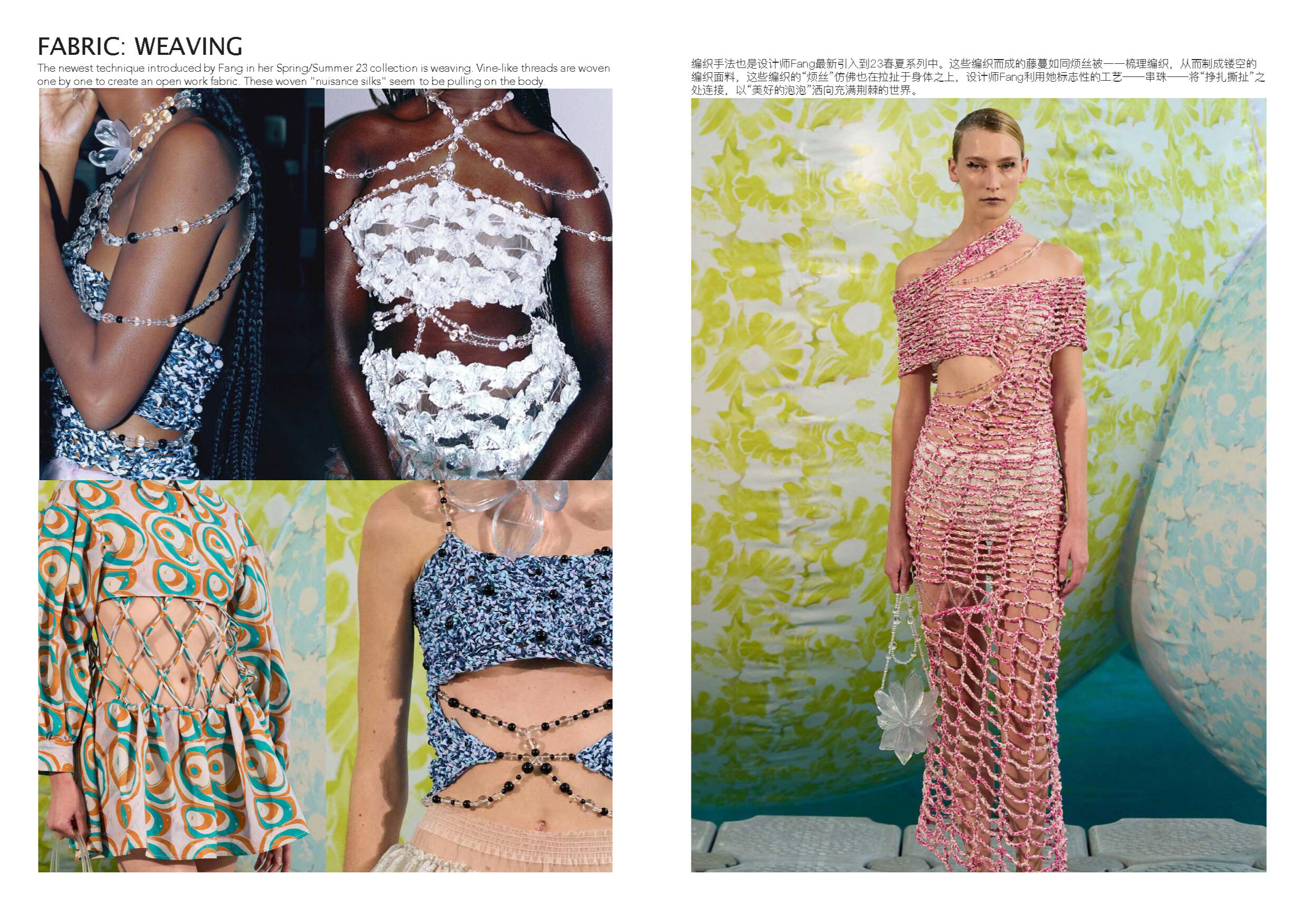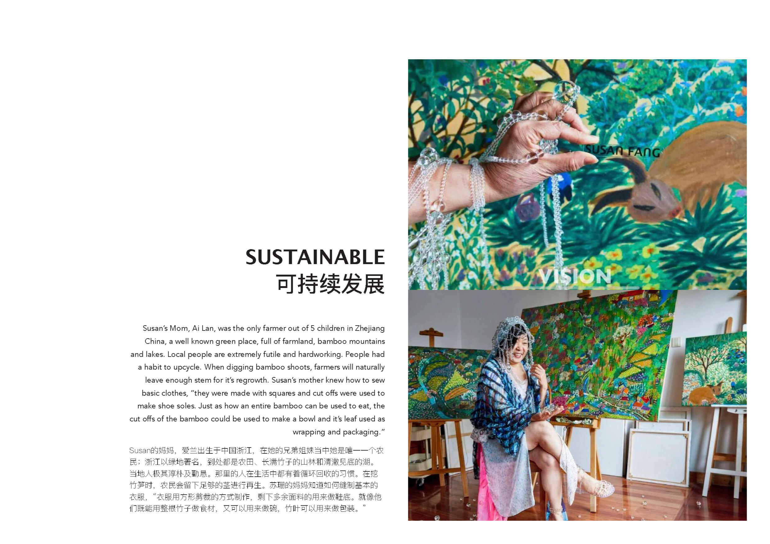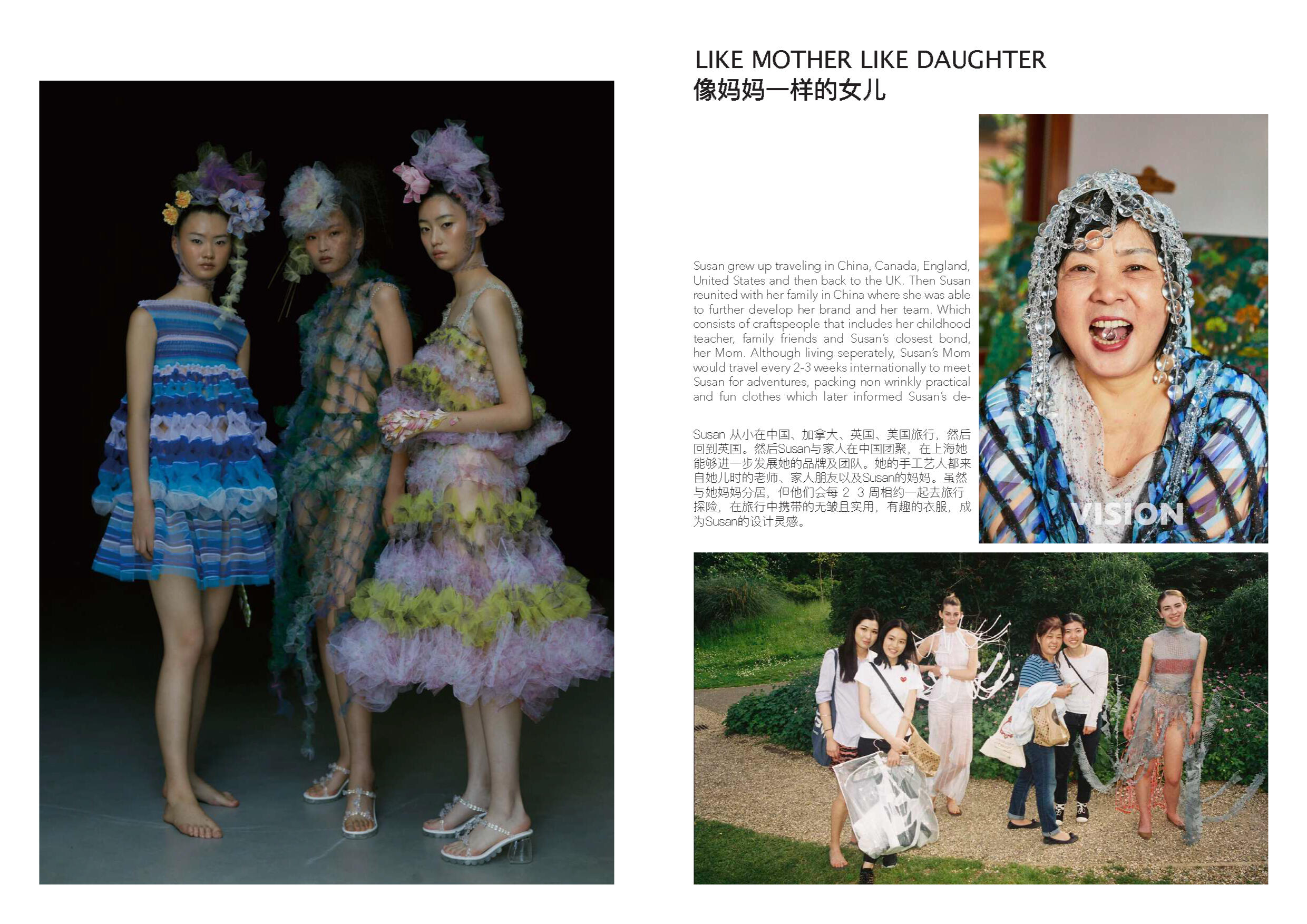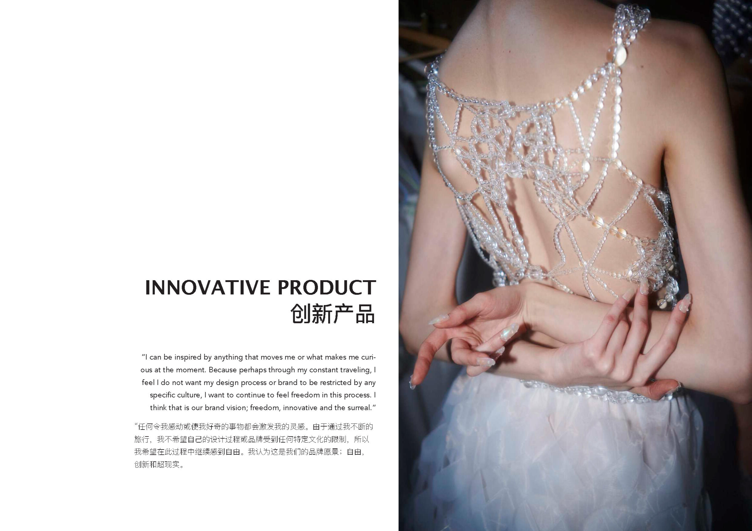 Susan Fang 的世界里就像诗歌一样唯美。她不 断受到大自然的魅力和对美感的启发来开展她 的每一个系列。从创新性的透明材料可以看出 图案的实用性以及服装的数学构造所展示了不 对称之美。用中国设计师的话说:“我的视野不 以潮流,风格甚至美学为指导,而是超越设计 领域来表达幻影的幻象。”