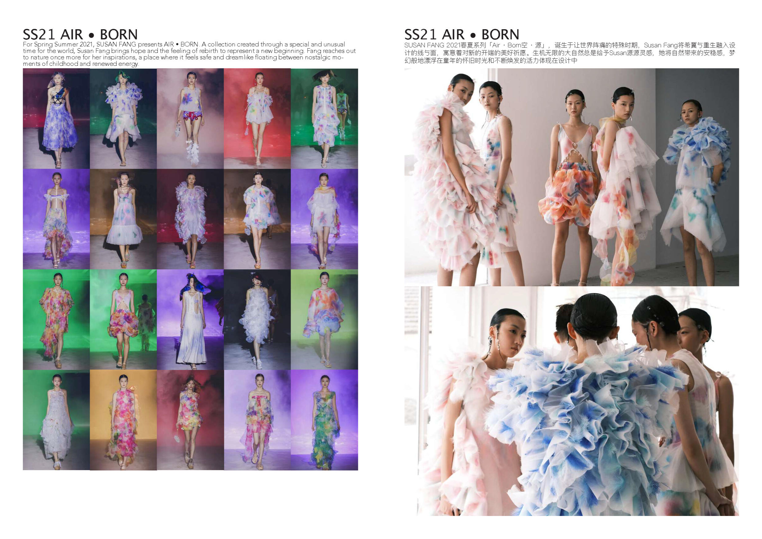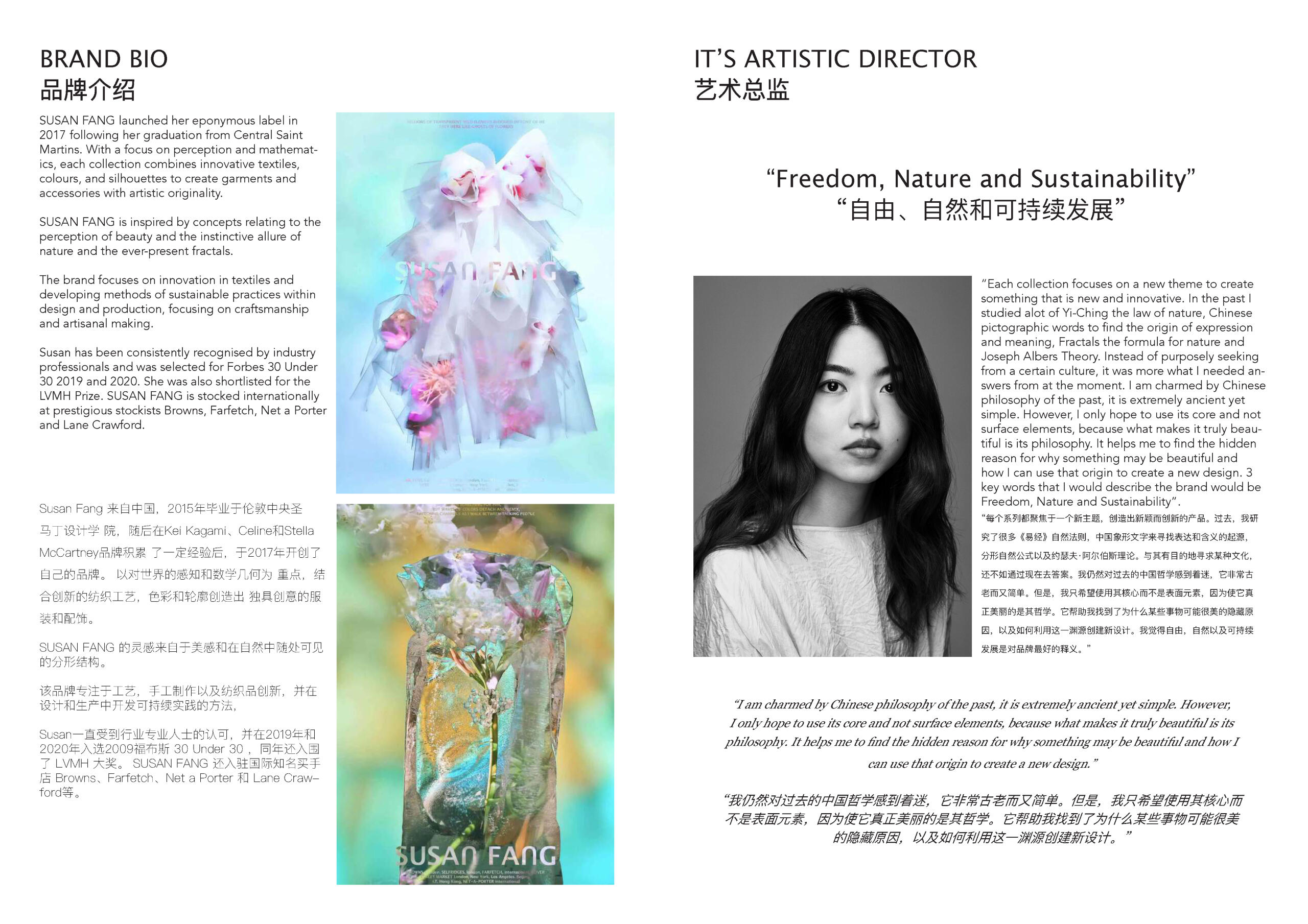SUSAN FANG品牌的灵感来自于美感和在自然中随处可见 的分形结构。该品牌专注于工艺,手工制作以及纺织品创新,并在设计和生产中开发可持续实践的方法,Susan一直受到行业专业人士的认可,并在2019年和2020年入选2009福布斯 30 Under 30 ,同年还入围 了LVMH大奖。 SUSAN FANG 还入驻国际知名买手店 Browns、Farfetch、Net a Porter 和 Lane Craw- ford等。