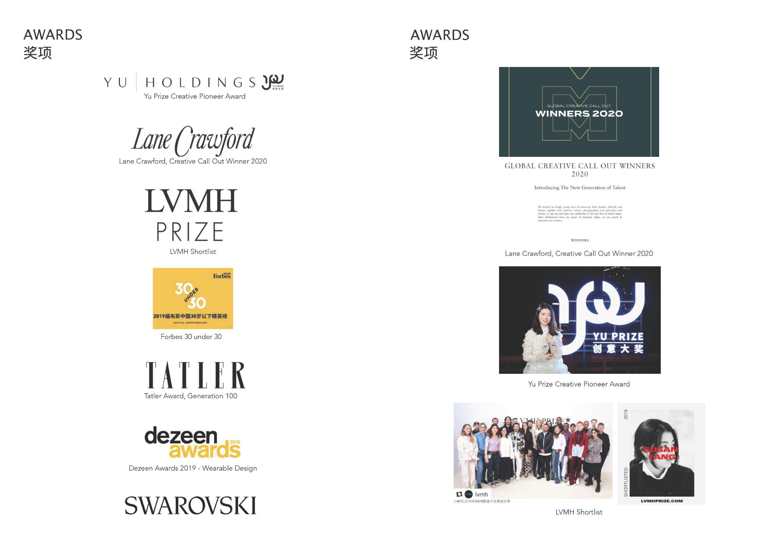 Susan has been consistently recognised by industry professionals and was selected for Forbes 30 Under 30 2019 and 2020. She was also shortlisted for the LVMH Prize. SUSAN FANG is stocked internationally at prestigious stockists Browns, Farfetch, Net a Porter and Lane Crawford. (Provided By Susan Fang)Susan Fang 来自中国,2015年毕业于伦敦中央圣马丁设计学 院,随后在Kei Kagami、Celine和Stella McCartney品牌积累 了一定经验后,于2017年开创了 自己的品牌。 以对世界的感知和数学几何为重点,结合创新的纺织工艺,色彩和轮廓创造出独具创意的服装和配饰。